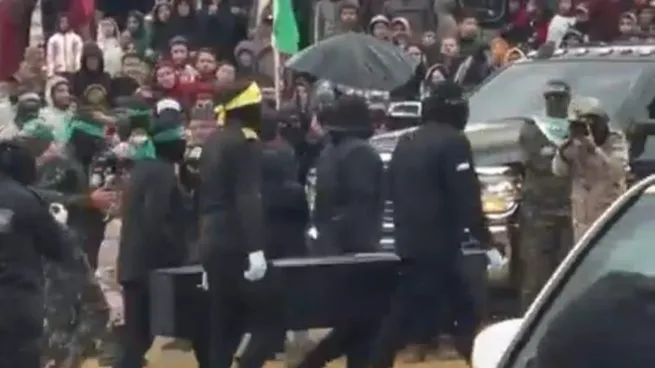 Previo a la entrega, los féretros fueron exhibidos en un escenario rodeado de milicianos armados vestidos con uniformes negros y de camuflaje. Un cartel en la zona mostraba la imagen de un hombre de pie sobre ataúdes envueltos en banderas israelíes, acompañado del mensaje: “El retorno de la guerra = El retorno de tus prisioneros en ataúdes”.