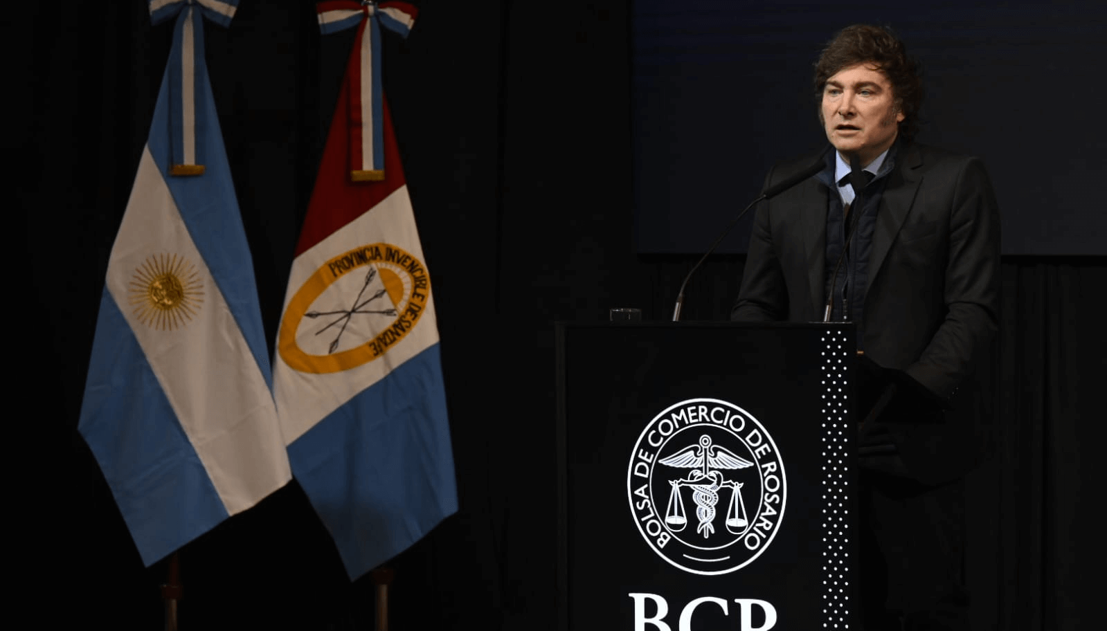 Javier Milei se presentó frente a 800 empresarios y líderes políticos en el acto por los 140° aniversario de la Bolsa de Comercio de Rosario, en donde horas antes se había recibido una amenaza de bomba.