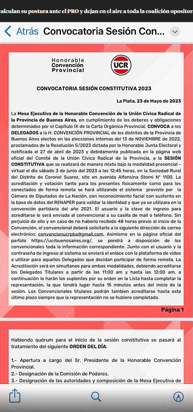 Quizás para evitar una fuerte discusión las autoridades partidarias convocaron a una reunión de la Convención Provincial para el próximo 3 de junio en Coronel Suárez, lo más alejado posible del conurbano, donde están la mayoría de los votos y a la cual se podrá participar, también por Zoom. «Nos están entregando», le dijo a MDZ un oficialista de Adelante Radicales, quien además describió que deberá recorrer casi 600 kilómetros para «tratar dos puntos, uno de los cuales autoriza a la mesa a fijar las políticas de alianzas».