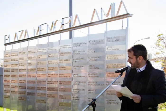 En el sector de bienvenida se ubicó una placa con los nombres de las 85 víctimas fatales y cerca de ella un visor de vidrio que permitirá observar parte de los escombros de la sede del edificio de Pasteur 633.
